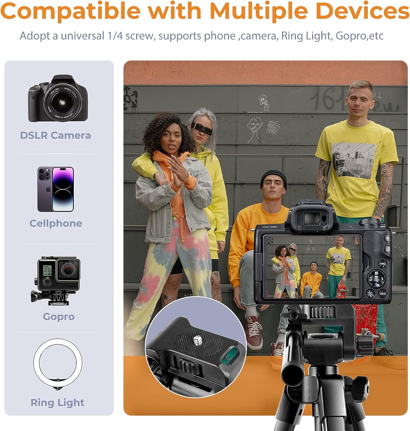 【Versatile Camera Tripod Stand with Rich Accessory】Equipped with a standard 1/4 screw and universal tripod phone mount, our tripod fits almost all digital cameras, action cameras and phones. The Bluetooth remote will free your hands to take photos at an maximum distance of 33ft.