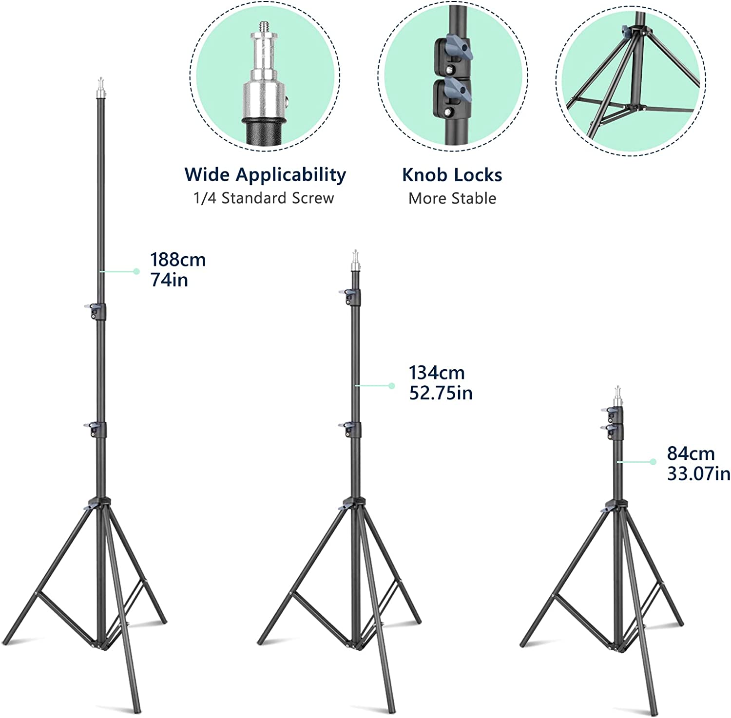 【Adjust the Soft box & Tripod Stand As You Like】The soft box has a 210° rotatable head which enables you to adjust its position freely, and the tripod stand’s height can be adjusted from 27” to 74.5” easily, you can choose your desired tripod height. The 1/4 standard screw on the top of the tripod enables you to install other devices to it such as a ring light, projector and etc.